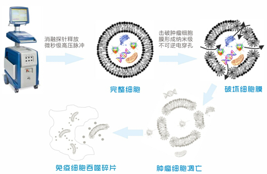 Нано-нож высвобождает высоковольтные импульсы в опухолевые клетки через зонд, вызывая необратимую электропорацию его клеточной мембраны в наномасштабе, что приводит к апоптозу клеток. После апоптоза опухолевых клеток фагоциты в организме охватили клеточный дебрис, и область лечения постепенно была заменена нормальными тканями.